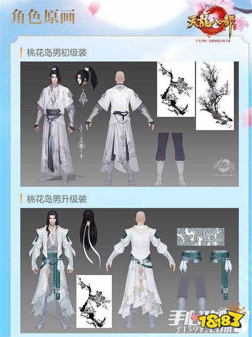 在公布新门派为桃花岛的同时,《天龙八部手游》还同步曝光了大量桃花岛相关原画手稿,其中包括了外观形象、门派时装、武器展示、门派场景。从外观形象来看,桃花岛淡雅脱尘,有清水出芙蓉之心,更有天然去雕饰之性。人物分男女两个性别,如小说中所描述的黄药师形象那般,均是手持玉箫,身着青衫布履。