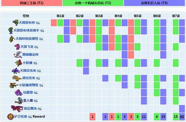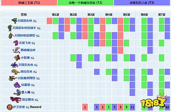 回答:在击败机器三个国王之前,撒旦军团事件只有5个波(阶段T1)。打败三王后,将升至7波(阶段T2)。当石巨人被击败时,波数仍然是7,但是怪物的出现将变得更难处理(T3阶段),并且第七波的头部将被替换双足翼龙。在一个撒旦军团事件中,最多只刷新一个双足翼龙。同时,共有2位小领导,分别为食人魔和黑魔法师。每次波之后,有一个短的过渡时间。玩家可以在酒吧购买道具商人,而水晶的顶部将显示下一个波浪倒计时。