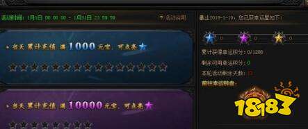 贪玩蓝月游戏中每天累计充值一定的金额可以激活对应的幸运星,每天可以激活三种幸运星各一颗,当天累计充值满1000元宝可以点亮一颗蓝色幸运星,当天累计充值满10000元宝,可以点亮一颗紫色幸运星,当天累计充值满100000元宝可以点亮一颗橙色幸运星。