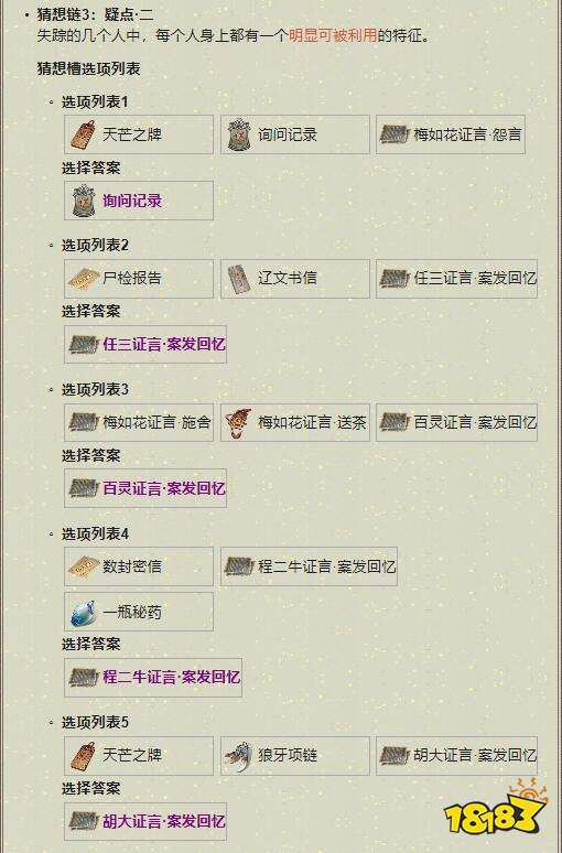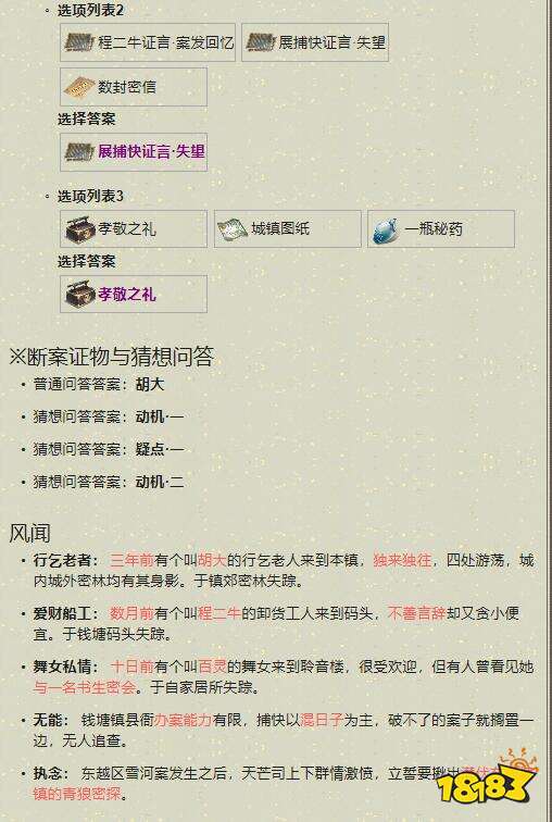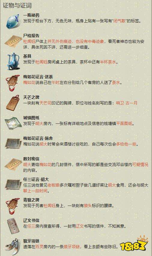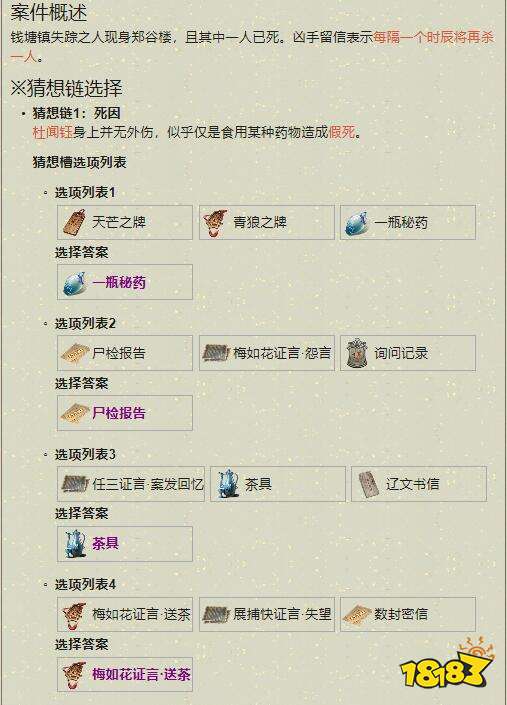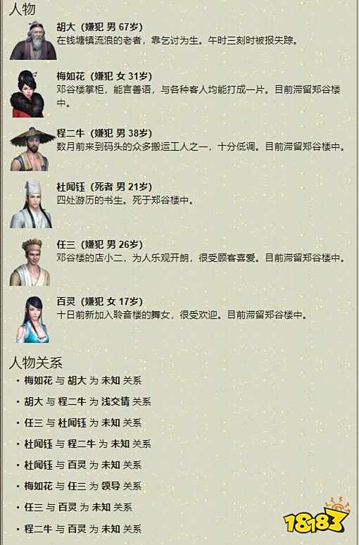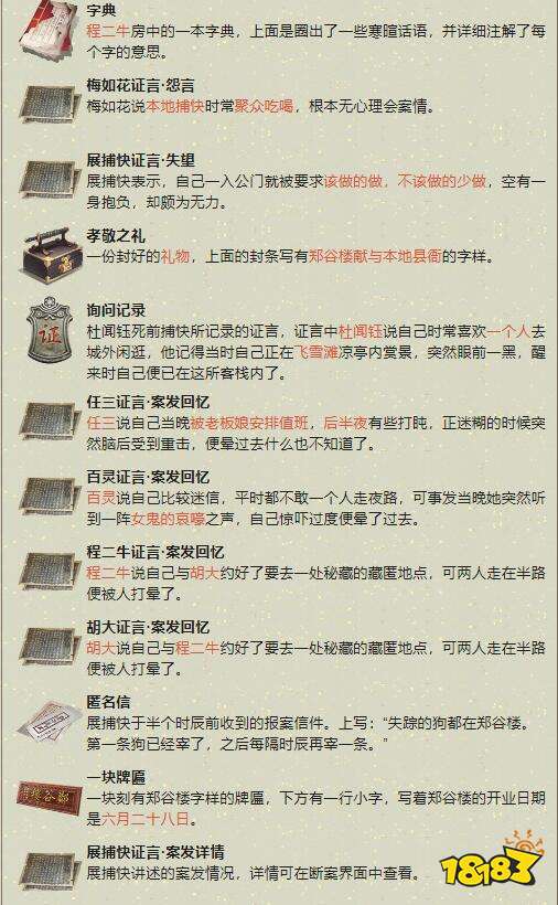 以上就是小编整理的关于《天涯明月刀》郑谷楼杀局案案件攻略的全部内容,更多游戏攻略请持续关注18183手游网!