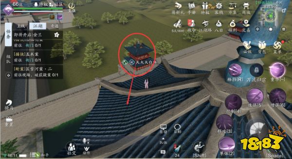 值得注意的是,此处不能自动寻路前往,需要先跳到五凤楼东北面城墙的阁楼上,再使用大轻功飞到五凤楼塔顶。