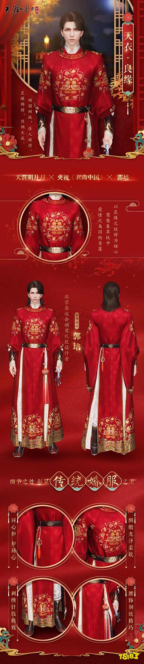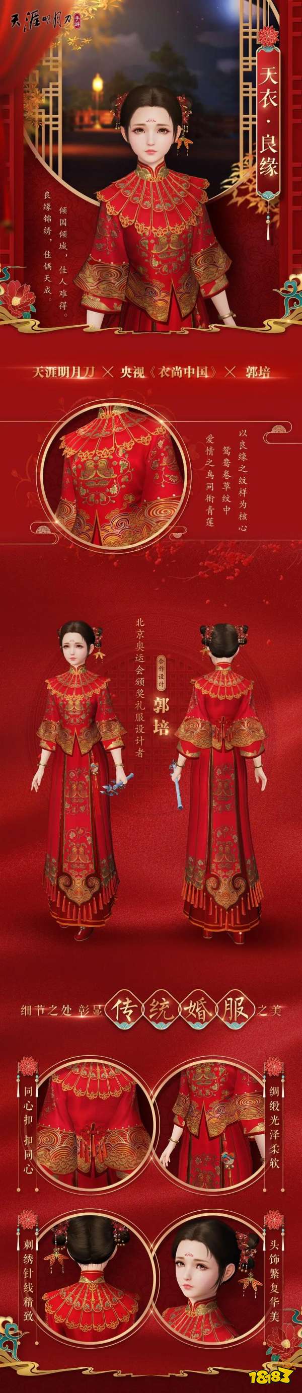 以数字匠心,传承国风之美。天涯明月刀 X 郭培 X央视栏目《衣尚中国》全新联动款良缘华裳“天衣·良缘”细节长图发布,以创新技术体验为针线,串起灿若繁星的中华优秀传统文化,承载唯美的国风良缘。