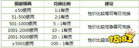 帮派捐献每日刷新一次,上述兑换比例采取累计制,单日兑换越高性价比越低,推荐每天兑换50-500即可。银两可以通过交易行或是镖师等玩法中获得,也可以使用点券用于兑换(兑换比例1:10)。