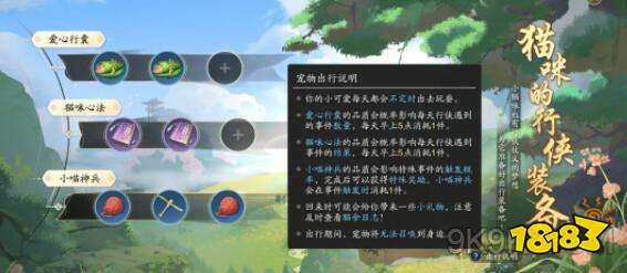 1. 猫咪行侠所需要的道具可以通过爱心值在宠物商店购买,品质不同行侠的结局也不同。这个玩过旅行青蛙的宝宝们都知道。