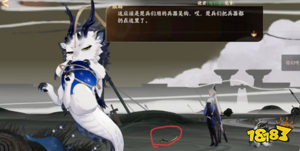 吴钩:偏左边,地上一个看起来像弯刀的物品。