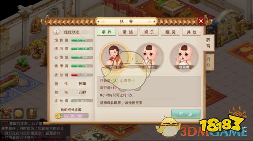 俗话说的好,生儿容易育儿难,想要养出一个聪明伶俐的大胖小子更是费心。道友们需要在娃娃婴幼儿时期精心照顾TA:喂养、清洁、娱乐、睡觉等都需要根据娃娃的状态进行适当的操作。当娃娃长到一定程度时,还可以为其安排学习、休闲行程,以提高娃娃的成长度、培养娃娃的各项资质属性。