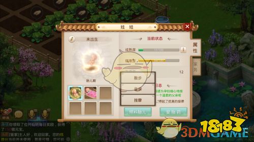 十月怀胎,一朝分娩,但在《问道》手游里只要照顾得当,最短耗时7日左右就能产出娃娃。孕妇需要每天散步、听音乐、丈夫帮忙按摩等方式保持住胎儿的健康值,成熟度累积满了,娃娃就可以出生了!