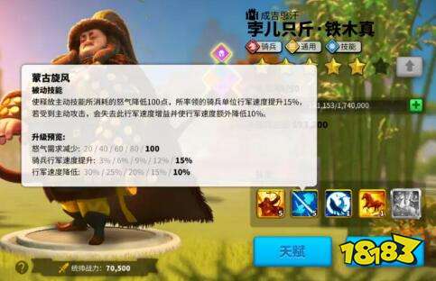 蒙古旋风(被动):主动技消耗怒气降低100点,提升15%行军速度,受到攻击失去速度增益并额外降低10%速度。
