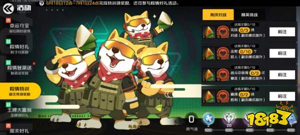 完成竞技对战和精英挑战的特训任务,可以领取肉粽和勇气值,其中肉粽可以在粽情好礼中兑换奖励,累计勇气值可以在特训活动界面兑换钻石、复活币、战备自选礼包、选手熟练度加速卡。