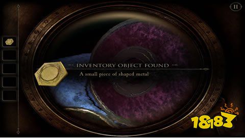 把我们刚弄到的完整的眼镜带上,对着这个圆盒子盖看上去,我们会发现有一个红色的指纹,这是我们点击指纹处。把手按倒红色指纹上去,这时我们会发现中间的小圆块会打开,我们会得到一个六边形铜片。