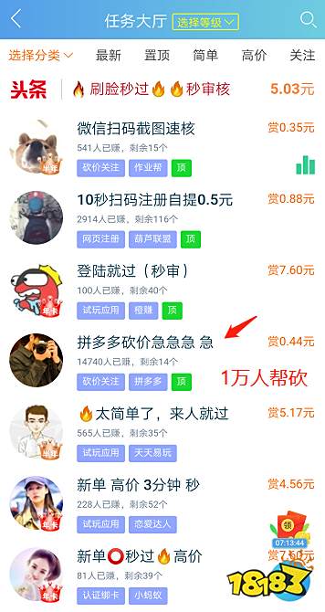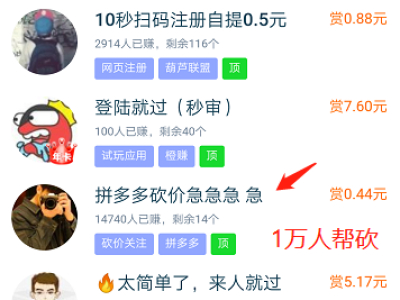 你想做简单任务,比如帮别人砍价或者关注公众号一单也就几毛钱,基本上也就几十秒搞定一个,单价高一点的就是注册下载类任务,一般一单佣金几元不等,所以一天做任务挣个50元还是很容易实现的。真正的无门槛副业项目,我自己都做了一年多了,非常的靠谱且良心。