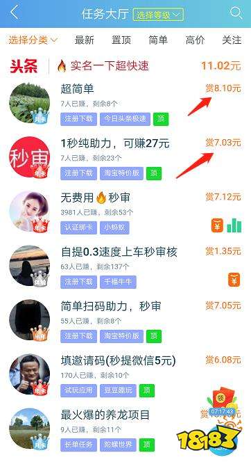 举个例子,不管在哪个平台里,我们做任务除了简单任务之外,我的建议就是多做一些注册下载类的软件,比如下载今日头条一单就挣8.1元,还有淘宝特价版一单佣金7.03元,你看这种任务只要你没做过,咱们2单就能挣15元了,所以做任务一天挣50元没啥难度。