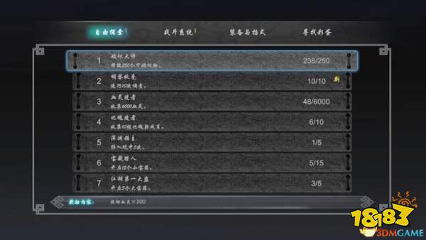 成就是获得奖励的一个途径,成就分为自由探索、战斗系统、装备与招式、寻找彩蛋四种。