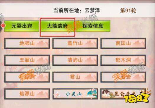 大能遗府的探索按钮在仙缘界面上方,元婴出窍旁边。点击就可以进入,大能遗府分为云梦泽、大雪山和古剑冢。本篇要介绍的是云梦泽。