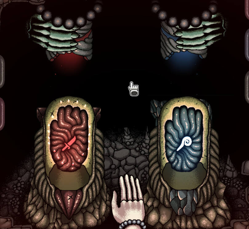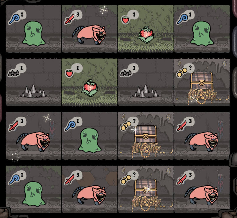 《Sol Cesto》的世界里,你只有一个目标,那就是在层层叠叠的随机地牢中一路向下,找到黯淡多年的太阳。每屏都有 4 个房间可供选择,随时一点即可进入。房间可选,但房内乾坤全然不可控:会不会有敌人杀出来?还是能撞见多金宝箱?有没有什么秘密亟待发掘?一切皆有可能……