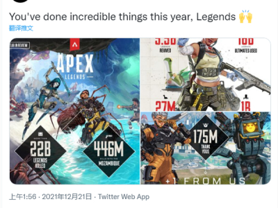 在《绝地求生》爆火之后,业内陆续涌现出了多款品质绝佳的后来者,其中以《使命召唤:战区》和《Apex英雄(Apex Legends)》青出于蓝而胜于蓝。随着步入岁末年终,Apex官推在日前分享了游戏2021年度玩家数据,一起来看看挑战者们这一年的战绩如何吧。