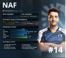 2018年的Liquid是全世界实力最稳定的队伍之一,他们多次打进各项赛事的决赛,但却一遍又一遍的输给巅峰时期的Astralis,这成了Liquid全队的心魔。尽管如此,NAF还是作为Liquid的明星选手脱颖而出,他在2018年度top20选手中位列第6名(全年个人rating为1.18),是当年北美地区排名最高的选手。