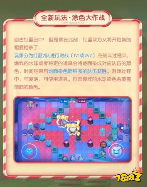 自古红蓝出CP,但是就在此刻,红蓝双方又将开始新的相爱相杀了.玩家分为红蓝2队进行对战 (1V1或2V2)在战斗过程中爆炸的水球或者特定的道具会将地面染成对应队伍的颜色,时间结束后地面染色面积多的队伍获胜。游戏过程中,可复活,可使用道具。后面爆炸的水球染色会覆盖前面的颜色。