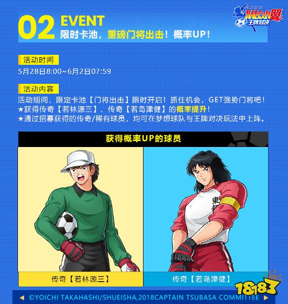 一场精彩的比赛,往往少不了优秀的守门员!本次测试将限时开启限定卡池【门将出击】,获得传奇【若林源三】、传奇【若岛津健】的概率将提升。