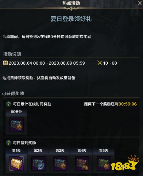 4、活动介绍:活动福利共两种,第一种是每日在线时长达到60分钟,即可领取当日奖励;第二种为每日签到奖励,登录后即可领取银币、材料箱等奖励。活动现已开启,领取方式简单,冒险家们赶紧前往吧~