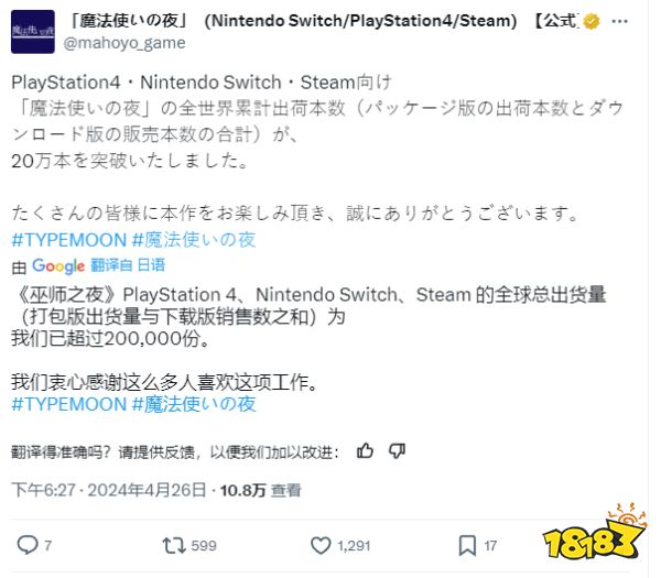 AVG视觉小说经典之作《魔法使之夜》,这款由TYPE-MOON出品的匠心巨献,源自TYPE-MOON灵魂人物奈须蘑菇早期执笔未发表、亦未完成的奇幻小说所改编而成的游戏,如今官方宣布其游戏的全球销量已耀破20万大关,正值热销高潮,各平台优惠活动火热进行。