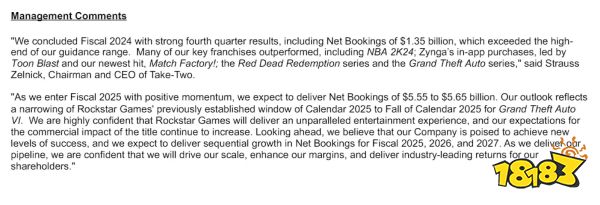 Take-Two 对《GTA 6》寄予厚望,强调公司以强劲的业务增长态势迈进2025财年,对Rockstar Games创造无与伦比娱乐体验的能力充满信心。并预期这款游戏将继续展现强大的商业影响力。随着《GTA 6》的发售期逐渐临近,全球玩家已开始摩拳擦掌,准备在次世代平台上见证这个疯狂且自由的开放世界的全新风貌。