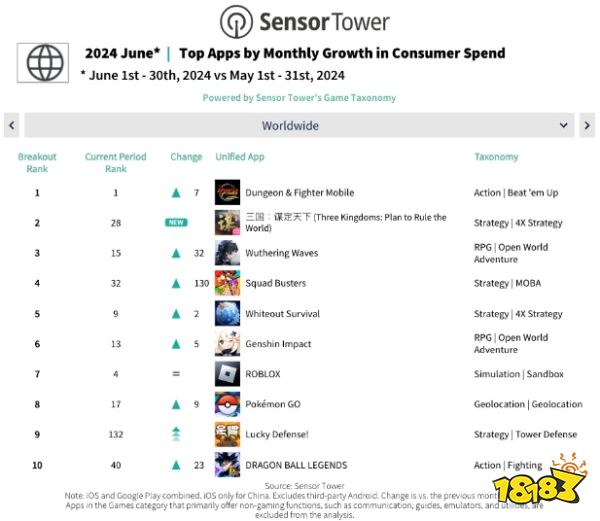 2024年6月全球手游收入增长榜动作格斗手游《Dungeon & Fighter Mobile》位列6月全球手游畅销榜和增长榜双榜首。由腾讯发行的国服版本《地下城与勇士:起源》,在2024年5月登陆中国市场并取得了巨大成功。该游戏将幻想元素、武术和快节奏动作的玩法相结合,赢得许多中国玩家的喜爱,在6月吸金近2.51亿美元,成为收入最高的手游。