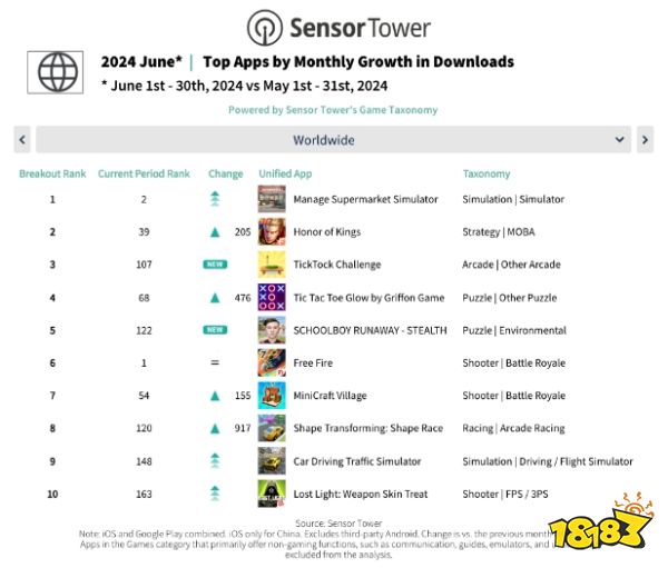 除了《Honor of Kings》取得卓越的表现,2024年6月下载量增长榜也突显了射击和模拟游戏在移动市场的持久魅力。在下载量增长榜TOP10中,有三款游戏来自大逃杀或第一人称射击品类,凸显了这些游戏在移动市场的强大吸引力。
