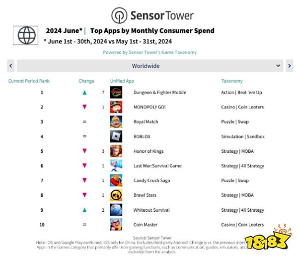 自2023年11月以来统领全球手游畅销榜的《MONOPOLY GO!》,在今年6月被《地下城与勇士:起源》超越。由点点互动发行的4X策略游戏《无尽冬日 Whiteout Survival》于2024年5月在中国上市,使得该游戏成功进入6月全球手游收入榜第9名, 目前全球累计下载量达到5250万次,总收入达到9.35亿美元。