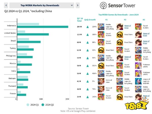 MOBA手游展现了巨大的潜力,2024年第二季度该品类全球玩家付费近12亿美元,是排名第3的品类,占据了手游市场6.1%的收入。随着新产品和经典手游的持续发力,MOBA在主要市场的下载量和收入实现了两位数的增长。