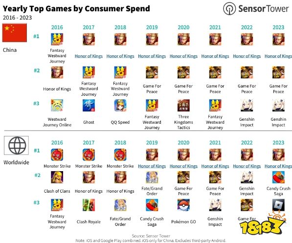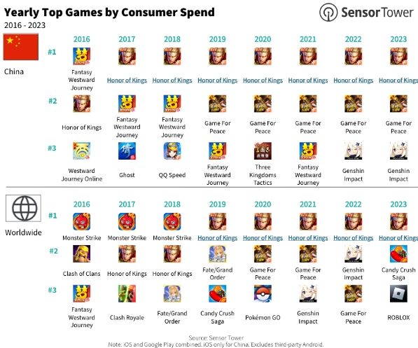 SensorTower发布《2024年6月全球移动游戏市场快报》,据《快报》显示腾讯旗下国民级MOBA游戏《王者荣耀》跻身全球手游下载量增长榜第二名。这款游戏最初于2015年在中国推出,在过去七年中一直稳居中国iOS手游畅销榜榜首。从全球范围来看,2019年至2023年间,凭借在中国iOS市场的收入,该游戏位列全球iOS和Google Play双平台总收入榜单第一名,成绩斐然。