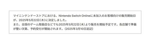 3月10日,日本任天堂宣布,针对未在My Nintendo Store订阅Nintendo Switch Online的客户,任天堂Alarmo闹钟公开销售定于5月22日开启,届时Alarmo闹钟将在My Nintendo Store和日本其他游戏商店不限量发售,各家商店将在准备完成后开启预购。