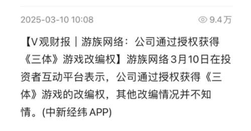 日前,据中新经纬报道,游族网络3月10日在投资者互动平台表示,公司通过授权获得《三体》游戏的改编权,其他改编情况并不知情。