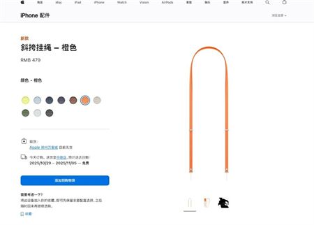苹果中国官网显示,目前,橙色斜挎挂绳在国内多地Apple Store零售店已为无货状态,预计送货时间为10月29日—11月5日。