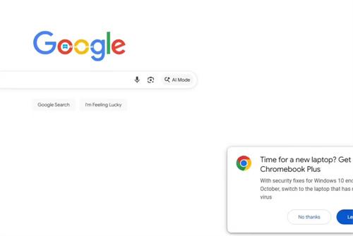 9月30日消息,Windows 10将于2025年10月14日终止官方支持,谷歌当日通过Google.com首页向部分用户推送弹窗广告。广告直言Windows 10即将失去安全更新,存在安全隐患,并推荐用户购买Chromebook Plus笔记本。