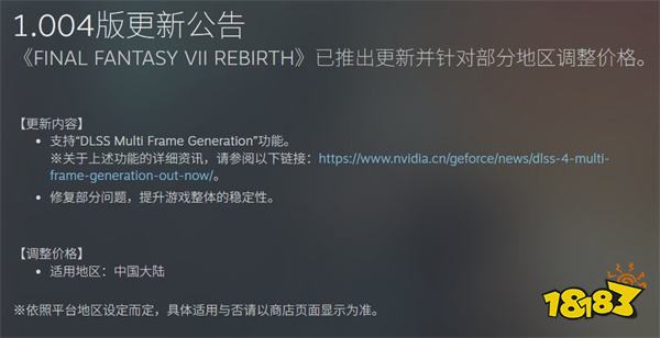Square Enix于11月4日发布公告,宣布对《最终幻想7:重生》及《最终幻想7:重制版》在Steam中国区实施永久降价,并同步推出游戏性能优化更新。