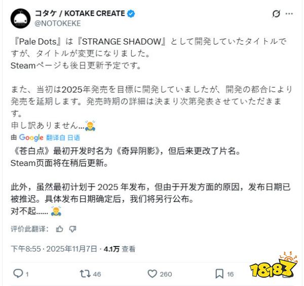 曾推出现象级游戏《8号出口》的开发商KOTAKE CREATE,近日通过官方推特公布了其新作的最新动态。这款备受期待的3D动作游戏名称已正式从《STRANGE SHADOW》(奇异阴影)更改为《Pale Dots》(苍白点),并确认将延期发售。