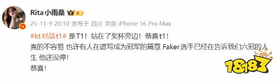 赛后,官方解说Rita难掩激动,在社交平台发文:“又是T1!他们再次站上巅峰!恭喜T1,真的太不容易了。当有人还在努力谱写冠军故事的时候,Faker已经在用六座冠军告诉我们——传奇,远未终结!”