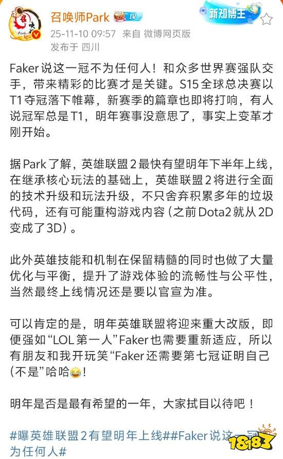 近日,有微博博主“召唤师Park”放出消息,透露《英雄联盟》或许真要出正统续作了!据他所说,《英雄联盟2》最快可能在2026年下半年推出,不仅会保留5V5对战等核心玩法,更将彻底进行技术重构,甩掉积累多年的“垃圾代码”,并大幅优化英雄技能与平衡性,让游戏更流畅公平。