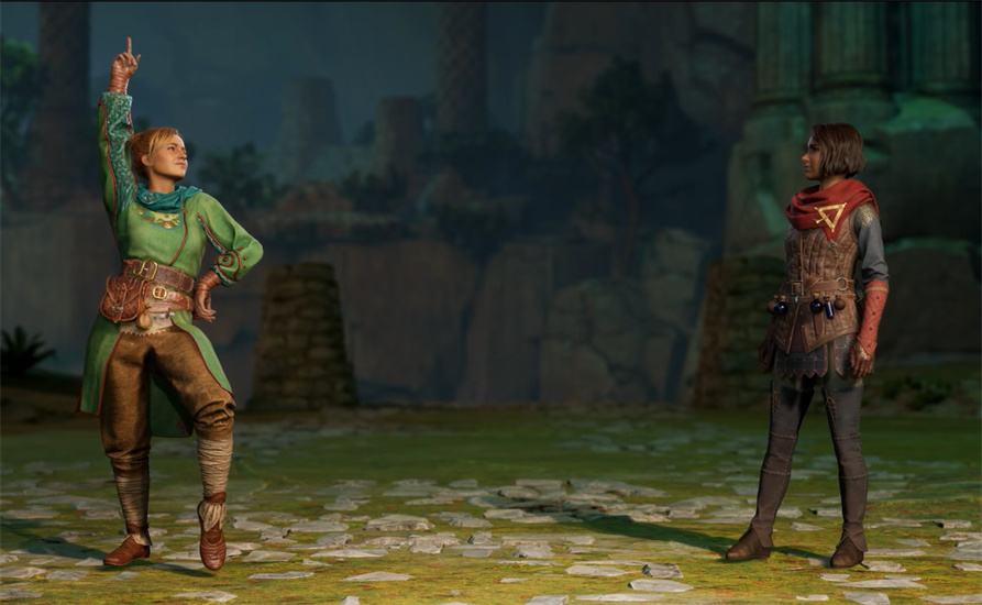 11、塔楼内部有一个朝上的机关,绿人先朝右边石块投掷能力拖拽机关再让紫人将其激活。然后移动到右侧爬到光柱上,绿人解除能力让光柱移动到中间,继续往上爬,跳到左边高台。