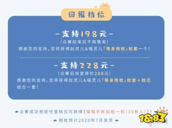 赵灵儿&喵灵儿抱枕长160cm,使用了2WAY面料,众筹支持198元即可获得“等身抱枕”枕套一个,众筹支持228元即可获得枕套+枕芯组合一套(众筹后恢复原价288元)。