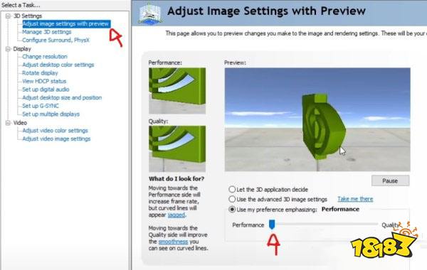 打开NVIDIA控制面板,在【通过预览调整图像设置】一项下,找到【使用我的优先选择-侧重于】,将滑块拖动至【性能】,点击应用。