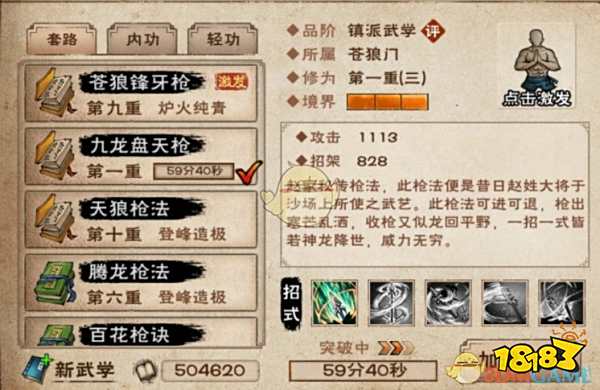 各位苍狼门玩家在完成全部的腾龙枪法后,回到仓苍狼门派鄯善,会出现一个新的NPC,找他对话就可以接到九龙盘天枪的前置任务了。
