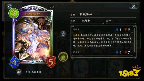 而在拥有机械降神的主战者BUFF以及手上有音箱时,则要通过局势判断能否通过音箱赢得比赛。如果可以,则要注意不要进入共鸣使得音箱被弃掉,也别忘记音箱可以触发机械降神的效果回一点费用;如果不能,则果断进入共鸣弃掉音箱通过降神路线来杀死对手。