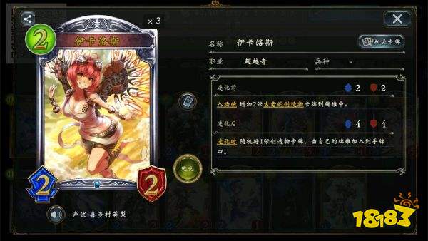 222标准身材,进化不亏身材可以做到增加造物抽取能力的同时,调整共鸣状态,是优质2费随从。但是洗入的古老造物不带抽卡效果,会污染牌库,也与加速装置的配合不佳,故在可以进行别的动作时不推荐优先下伊卡。
