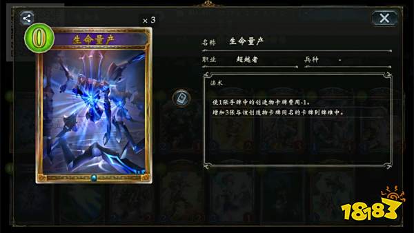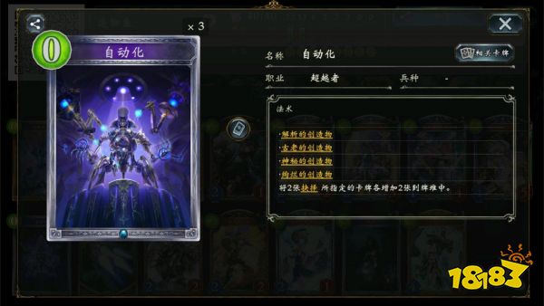 卡组核心之一,造物超越者后期无穷无尽的解场能力的来源,配合机械降神的主战者BUFF,一张创造物随从回2点费用,通过使用1费造物进行解场,再用回复的费用进行铺场。
