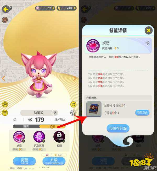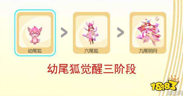 幼尾狐在1级时,是一个卖萌的小可爱,当它升级到10级后,就可以觉醒到第二阶段,变身为一个拥有六条尾巴的少女狐狸,当它升级到30级后,就可以觉醒第三阶段,幻化为一只魅惑十足,拥有九尾狐狸妖灵-九尾明月啦。