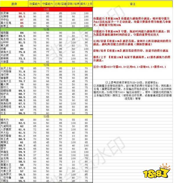 用于参考的神灵等级为35-39级,技能等级4。以后随着总体等级的提升,部分神灵的得分可能会下降。例如真火玄龟(盾更容易被打破,水系输出开始普及)龟丞相(法攻种族值成长低,50级只有7000+ 输出会疲软),犀牛(被新出现的强力土系输出克制)颜如玉(或者普遍成型后的禁锢流克制)等等等