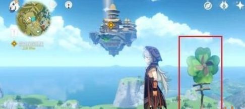 《原神》怎么去浮城这是浮沉的位置,在图中可以红色方框的四叶草,玩家只需要使用风属性角色开启这个四叶草机关就能,打开一个风场,就能去到浮沉了。