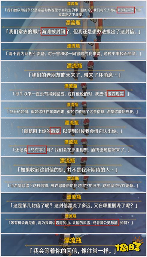 首先,我们可以从碎片中得知,漂流瓶不只发出了三个。我们拾取到的或许只是众多漂流瓶中的几个,而漂流瓶的主人是想通过这种方式寻找一个音讯全无的友人。其中【战争】与【大御所大人的雷霆号之怒】说明了漂流瓶的主人处于战乱之中,无法亲自去大陆其他地方寻找他的友人。或许也只有这样,才能理解他丢出一个又一个瓶子的用意。